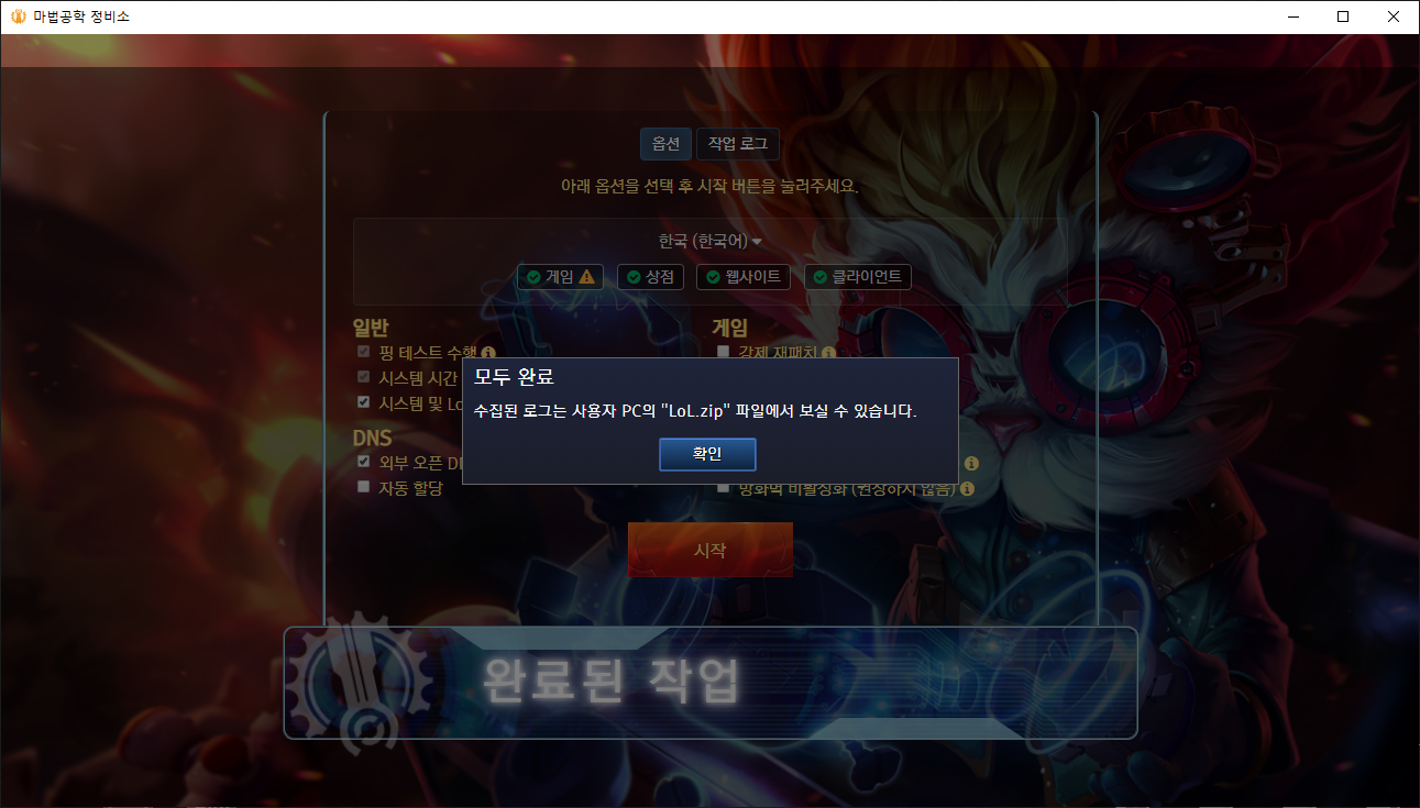 4. 모든 작업이 완료되면 위와 같은 화면이 나오며 바탕화면에 수집된 로그파일 LoL.zip이 생성됩니다.
