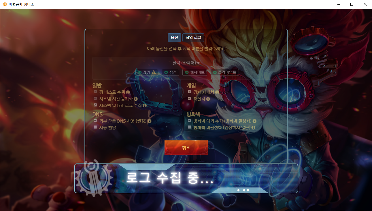 2. 단계별로 순차적으로 복구 테스트를 진행해 봅니다. 나는 시간이 오래 걸려도 한방에 복구하고 싶다면 바로 3단계로 진행해도 됩니다. 기본적으로 '시스템 및 LoL 로그 수집', '외부 오픈 DNS' 사용에 공통으로 체크하고 시작합니다.