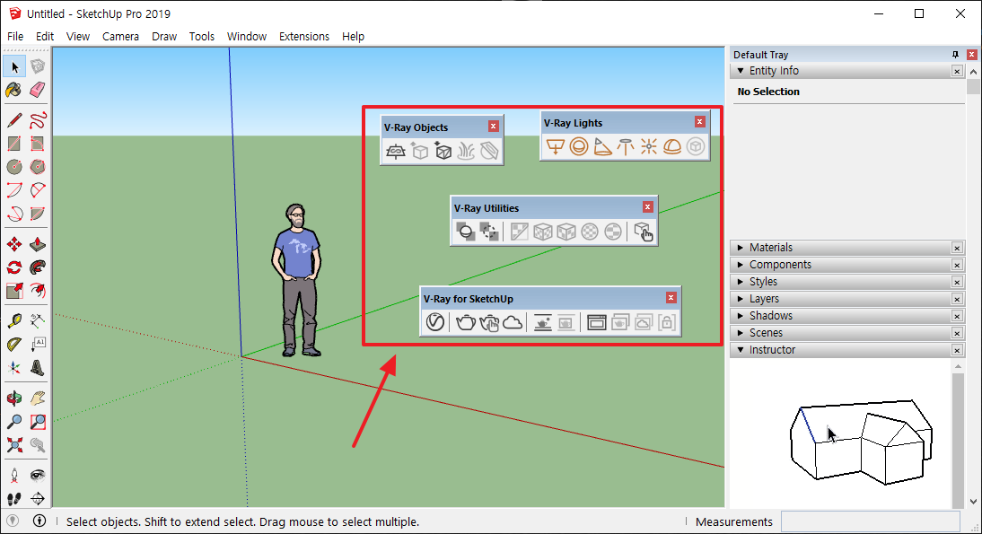 프로그램이 설치가 모두 완료되면 이제 스케치업 포그램을 실행시켜 Vray 기능이 활성화 되어있는지 확인합니다. 위와같이 홈 화면에 'Objects, Lights, Utilities, Sketchup' 기능이 활성화 되면 제대로 설치된 상태입니다.