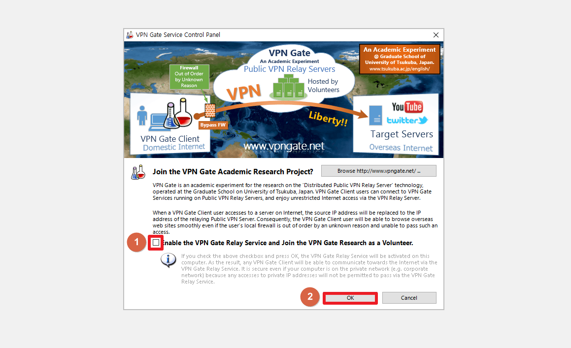 처음 실행할 경우 VPN GATE Service 컨트롤 패널에서 제공하는 위와같은 안내 창이 나옵니다. 아카데미 조사 프로젝트 참여 여부를 묻는 팝업창으로 허용 여부가 프로그램 사용에 영향을 주지 않습니다. 아래 '체크박스'를 해제한 뒤 'OK'를 클릭합니다.