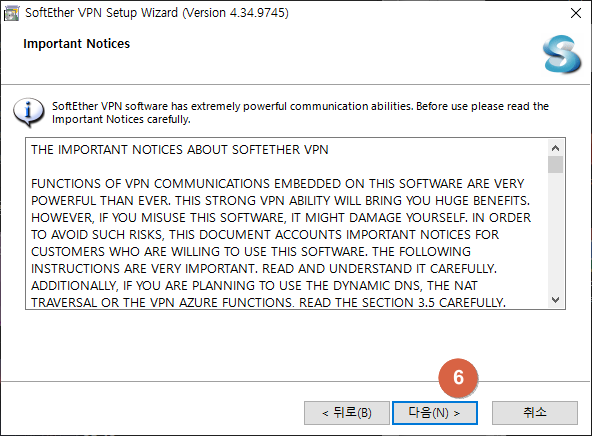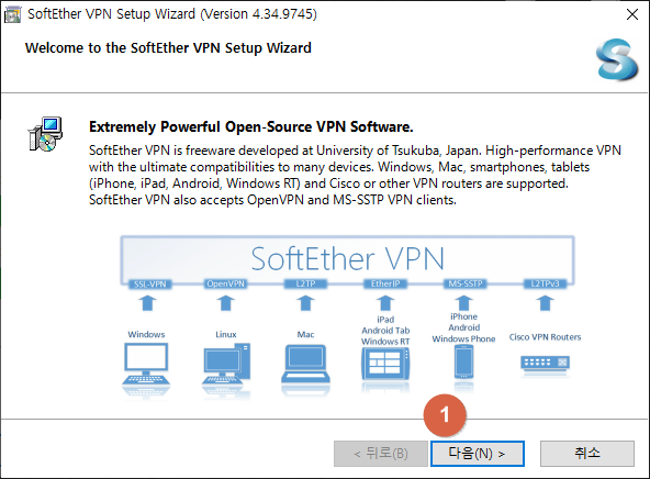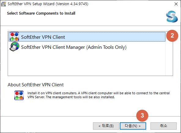 SoftEther VPN 설치 마법사가 열리면 아래 '다음'을 클릭합니다. 프로그램 설치 구성화면이 나오면 'SoftEther VPN Client'에 체크한 뒤 '다음'을 클릭합니다.