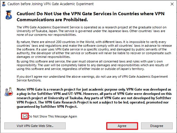위와 같이 VPN 서버를 사용할 때 필요한 주의사항이 나옵니다. 아래 Do not Show This Message Again에 체크한 뒤 Agree를 클릭합니다. 만약 체크하지 않고 Agree를 클릭할 경우 서버를 변경할 때마다 위 경고창이 계속 발생합니다.