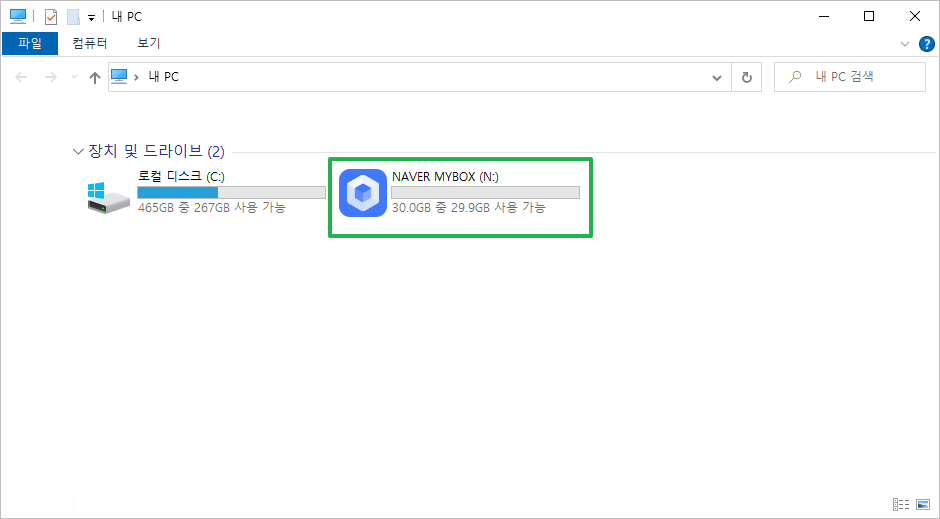 동기화가 완료되면 '내 PC'로 들어가면 가상 하드디스크인 'NAVER MYBOX' 생성됩니다.