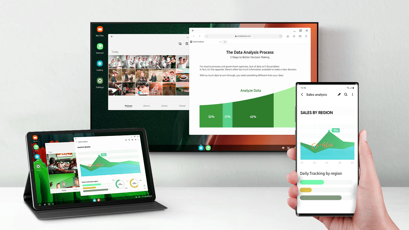 삼성 덱스는 삼성 갤럭시 스마트 기기를 더 스마트하게 사용하기 위한 멀티 태스킹 프로그램입니다. 삼성 덱스를 사용하면 스마트폰 화면을 손쉽게 모니터, TV와 같은 큰 화면으로 생생하게 즐기고 저장된 파일을 손쉽게 전송하거나 PC와 Mac에서 휴대전화의 가능성을 잠금 해제할 수 있습니다. 뿐만 아니라 일상적인 프로젝트, 프레젠테이션 작업을 회의실 모니터에 연결해 손쉽게 엑세스하고 스마트폰을 이용해 제어할 수 있습니다. 삼성 덱스 모드에서는 한 번의 두 개 이상의 화면을 띄울 수 있기 때문에 영화를 보거나 게임을 즐기면서 문서를 검토하고 전화를 받을 수 있기 때문에 두배의 작업 효율을 수행할 수 있습니다.