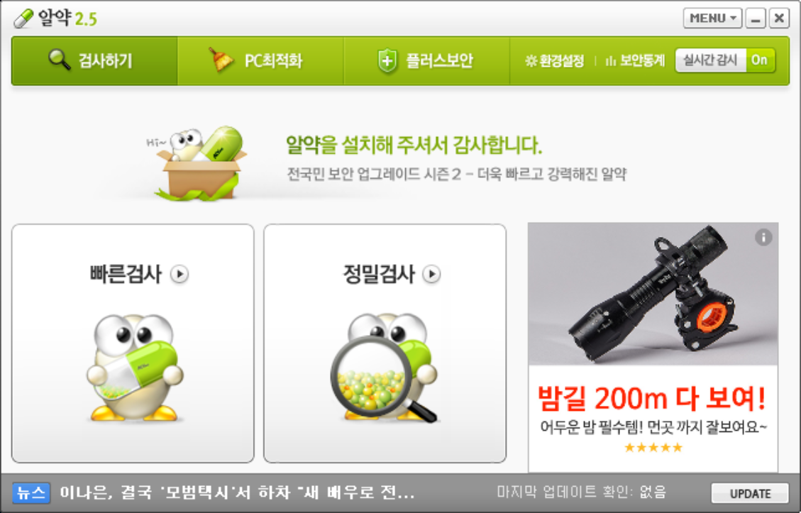 이제 바탕화면에 생성된 알약 실행파일을 더블 클릭해 실행시킵니다. 메인화면에서 검사하기 PC최적화 플러스보안 등의 기능을 빠르게 활성화시킬 수 있으며 우측 하단에 있는 UPDATE를 통해 지속적인 업데이트를 지원받을 수 있습니다.
